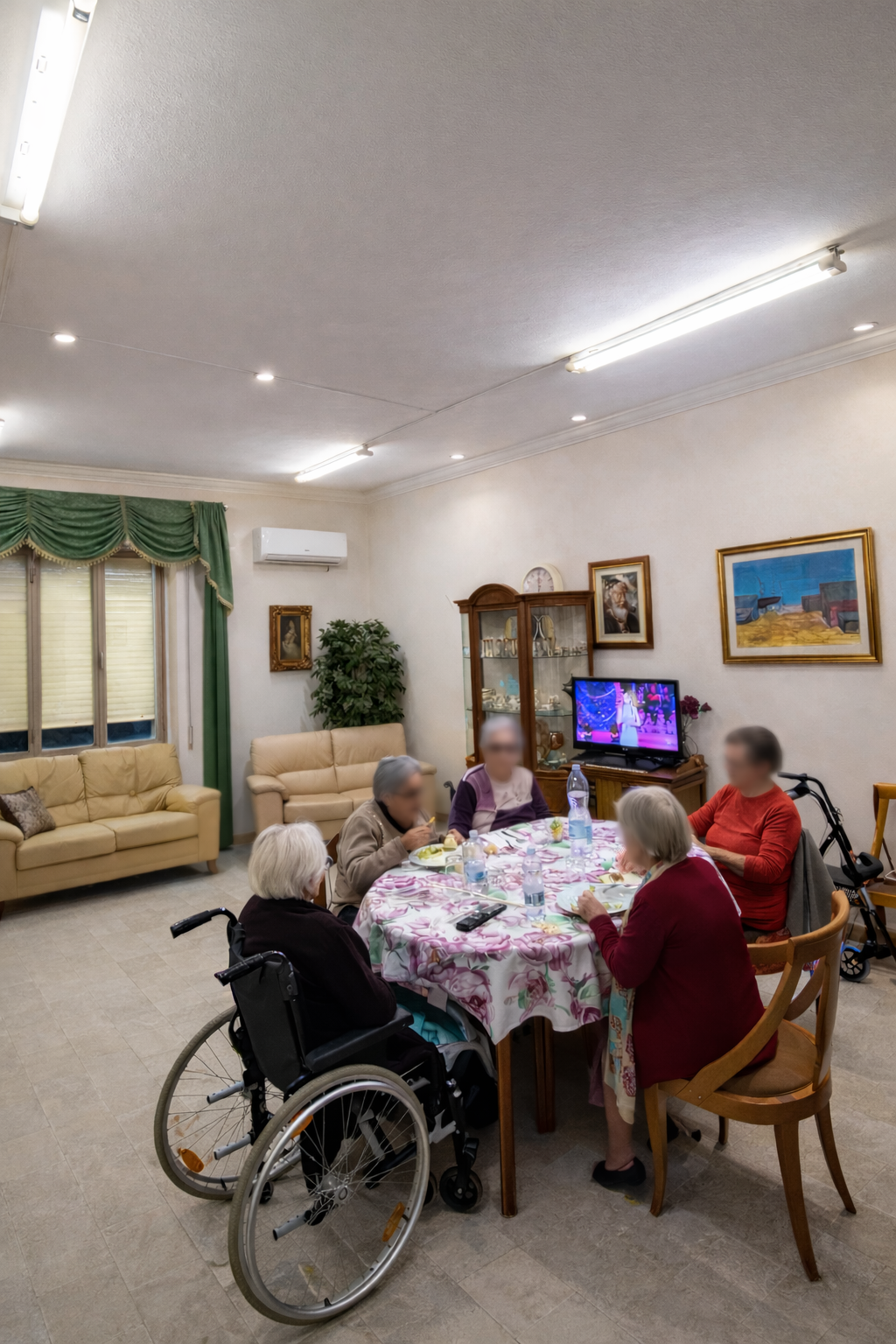 Attività ricreative gestite dall’educatrice in ambienti comuni: con divani, poltrone, tavoli e televisione.